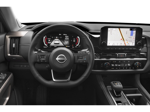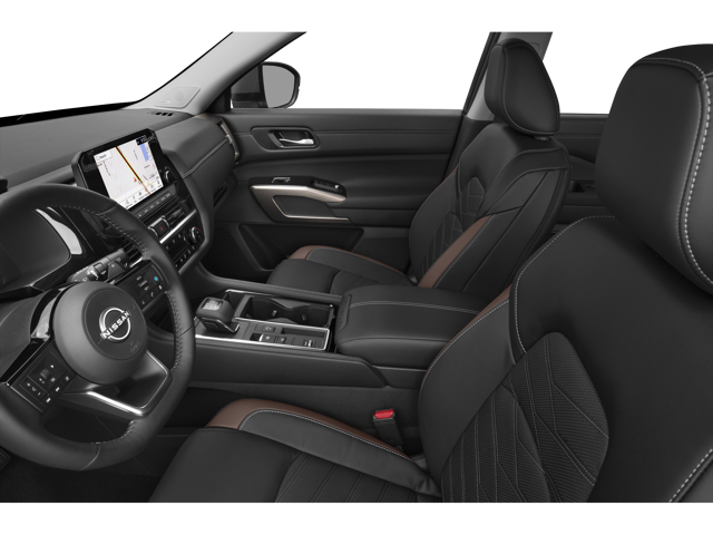 The Pathfinder's cabin offers flexible seating for up to eight passengers, or seven if you opt for the second-row captain's chairs. The SV and higher trims feature an eight-way power adjustable driver's seat and 9-inch touchscreen infotainment system. The SL and Platinum models add a 12.3-inch digital instrument cluster and premium leather-appointed seats. The Rock Creek trim includes water-repellent leatherette seats with embroidered logos and orange contrast stitching. With all seats folded, the Pathfinder provides 80.5 cubic feet of cargo space. All trims include tri-zone automatic temperature control for passenger comfort.