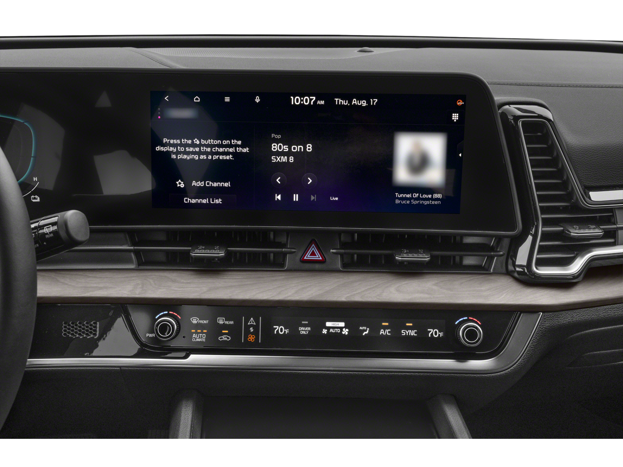 - Radio: AM/FM/HD Audio System -inc: 12.3" touchscreen w/navigation, 6 speakers,Apple CarPlay and Android Auto, Kia Connect, voice recognition, satellite radio, steering wheel mounted audio controls, USB and Bluetooth phone and streaming audio